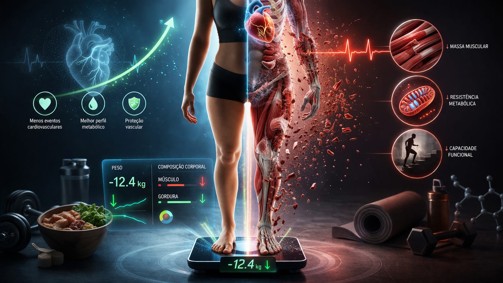 Mas… existe um “porém” que começa a ganhar protagonismo: uma parte relevante dessa perda não é gordura. É músculo.