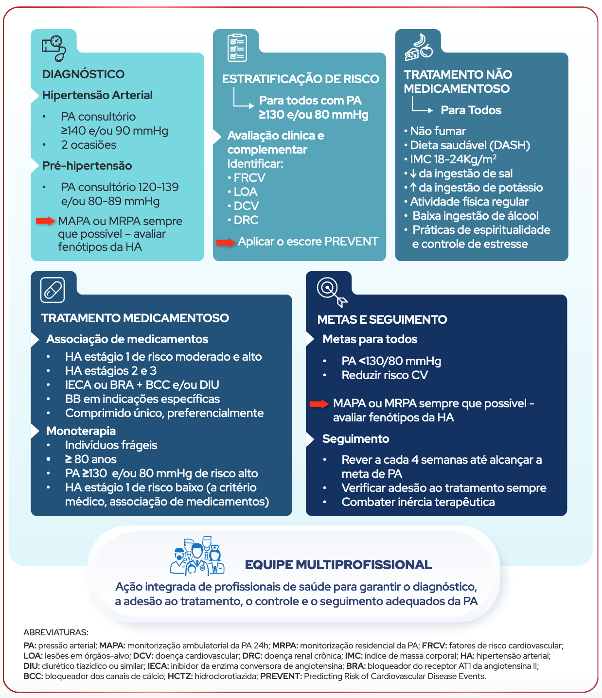 A diretriz também reforça a adoção sistemática de MAPA e MRPA para diagnóstico e seguimento, evitando tanto falsos-positivos (hipertensão do avental branco) quanto falsos-negativos (hipertensão mascarada), e a preferência pelo aparelho automático nas aferições de consultório.