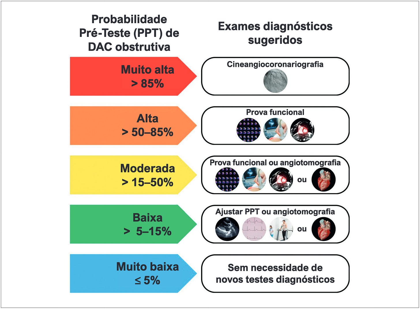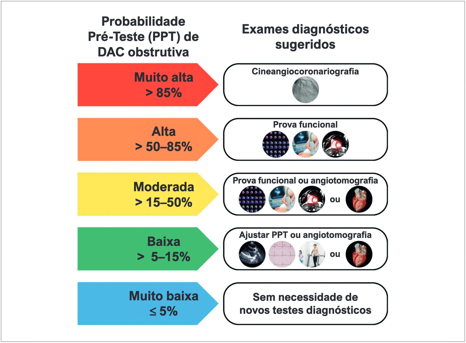 Na avaliação inicial, a probabilidade pré-teste (PPT) foi atualizada, abandonando modelos antigos como Diamond-Forrester e reforçando a necessidade de contextualizar risco clínico e populacional.