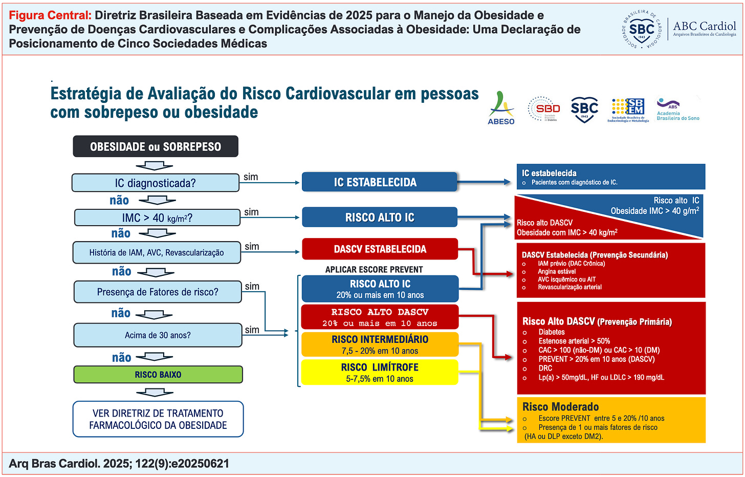A diretriz começa reforçando a estratificação obrigatória de risco em todo paciente com sobrepeso ou obesidade, usando o escore PREVENT (olha ele aí mais uma vez!), e lembrando que a reclassificação pode ser feita com cálcio coronariano, Lp(a) elevado, DM2 de longa data ou DRC.