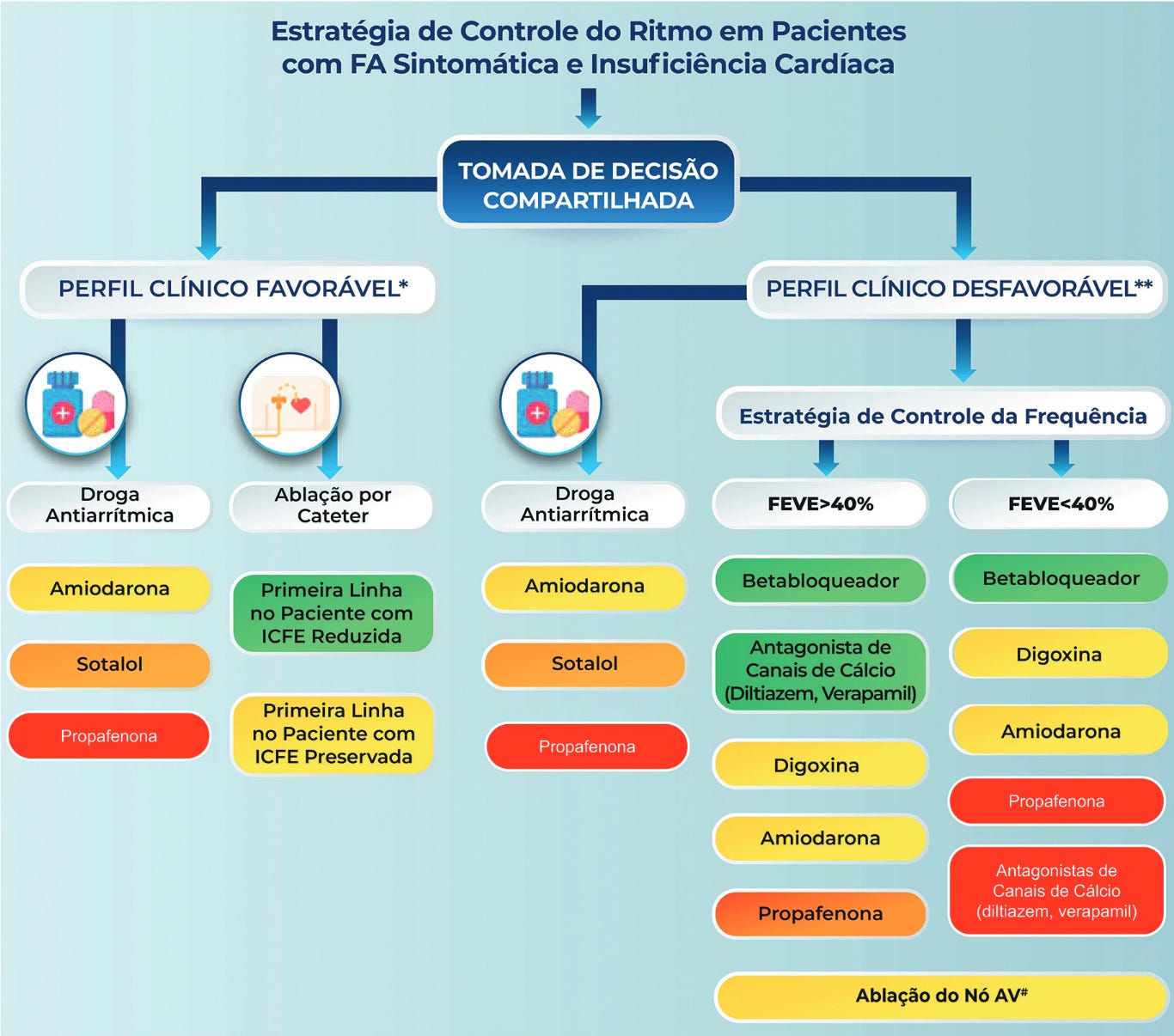 Quando o assunto é manejo, controle de frequência e de ritmo continuam válidos, mas agora o controle de ritmo ganha protagonismo mais cedo, sobretudo em pacientes jovens, sintomáticos ou com insuficiência cardíaca.