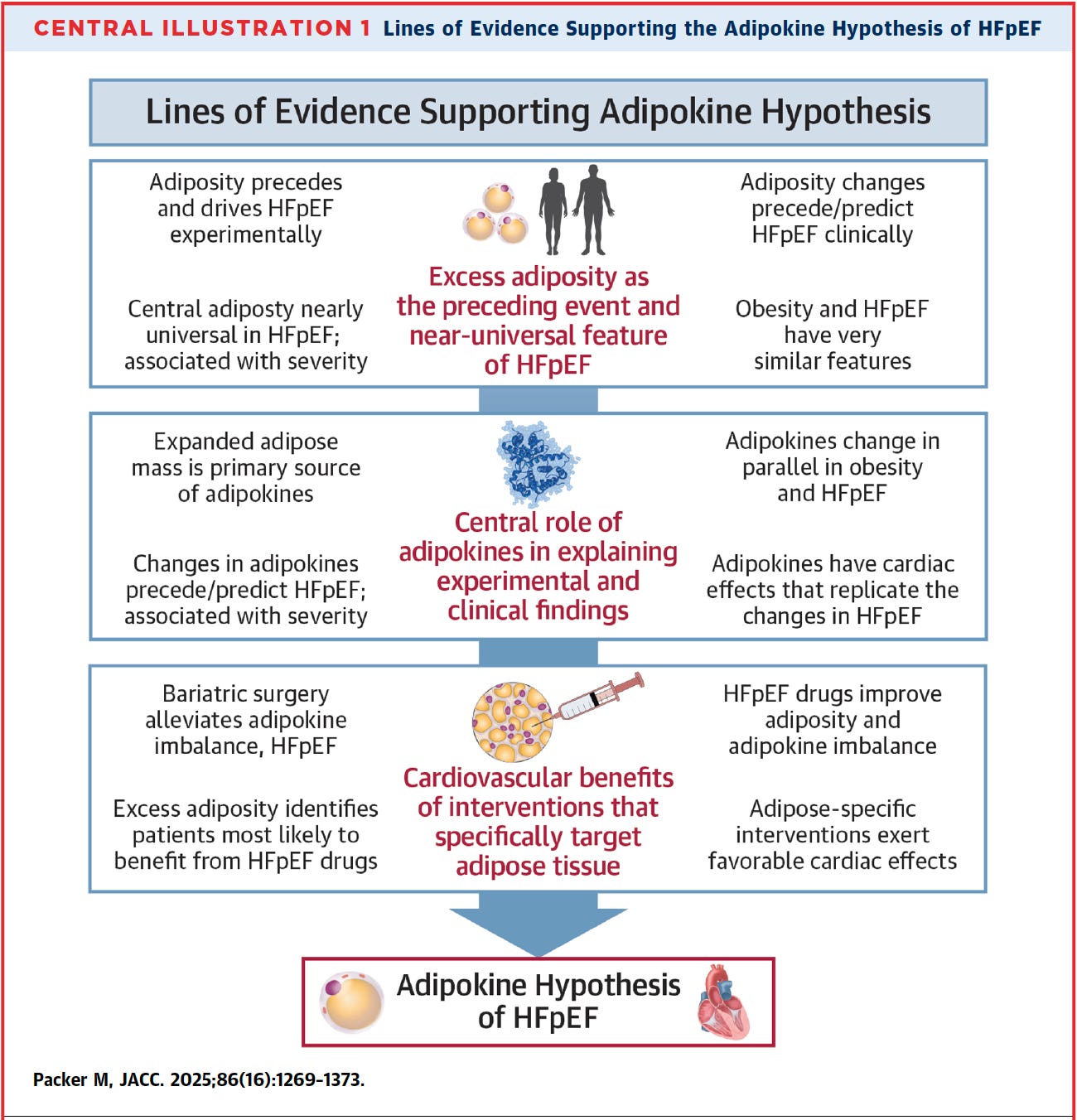E é exatamente esse o foco da hipótese adipocina da insuficiência cardíaca com fração de ejeção preservada (ICFEP), proposta por Milton Packer no JACC em 2025.