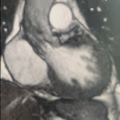 Dupla lesão valvar aórtica vista à ressonância magnética cardíaca. Observe o turbilhonamento do jato na topografia da valva aórtica, associado ao jato regurgitante durante a diástole.