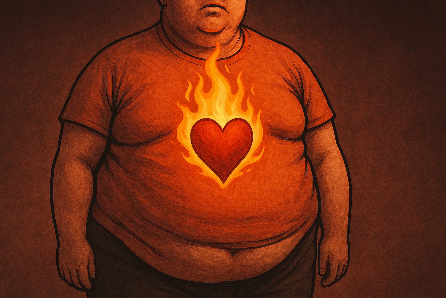 Em vez de um coração que falha por cansaço, é um coração que sofre pelo calor tóxico gerado pela gordura visceral disfuncional.