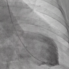 Ventriculografia evidenciando dissincronia interventricular, associada a fibrilação atrial e queda da fração de ejeção do VE. Bonito, não é?!