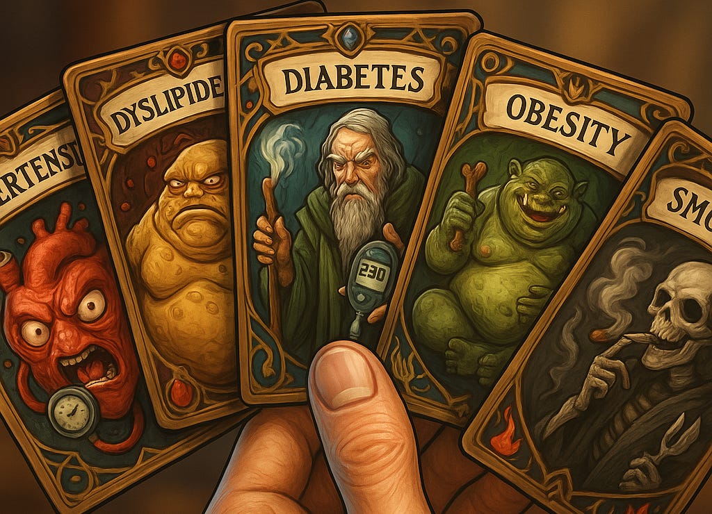 🃏 As 5 cartas do mal: hipertensão, dislipidemia, diabetes, obesidade/sobrepeso e tabagismo.