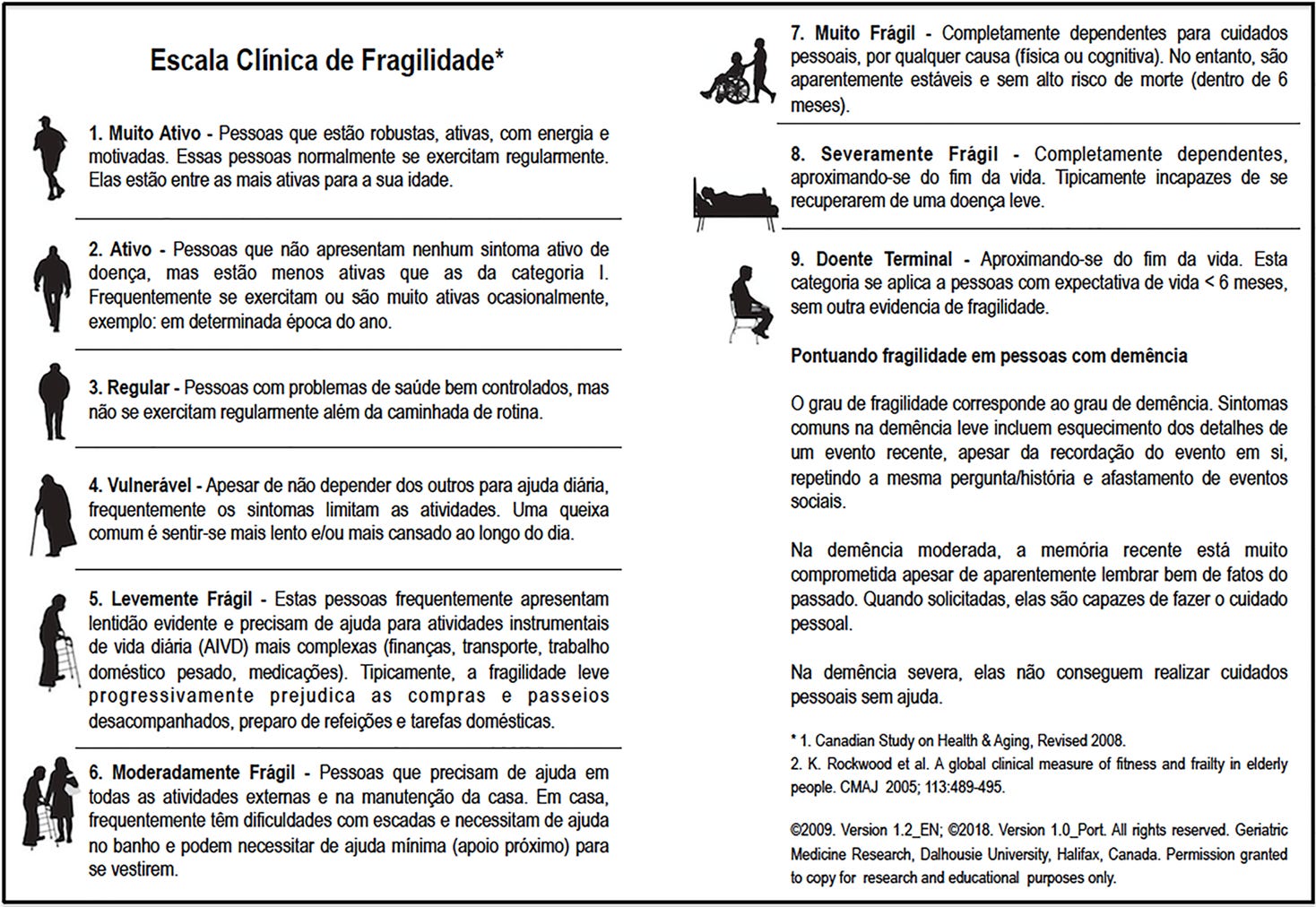 A Clinical Frailty Scale, um escore visual de 1 a 9, permitiu a classificação dos pacientes em 6 categorias (1-2, 3, 4, 5, 6, and 7-9), que foram comparadas com testes formais de função física (força de preensão, velocidade de marcha, Short Physical Performance Battery, teste de caminhada de 6 minutos) e cognição (Mini-Cog).