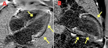 Paciente em investigação de cardiopatia infiltrativa. Realiza ressonância magnética cardíaca que identifica um clássico padrão de realce tardio subendocárdico e difuso (setas). O diagnóstico: amiloidose cardíaca.
