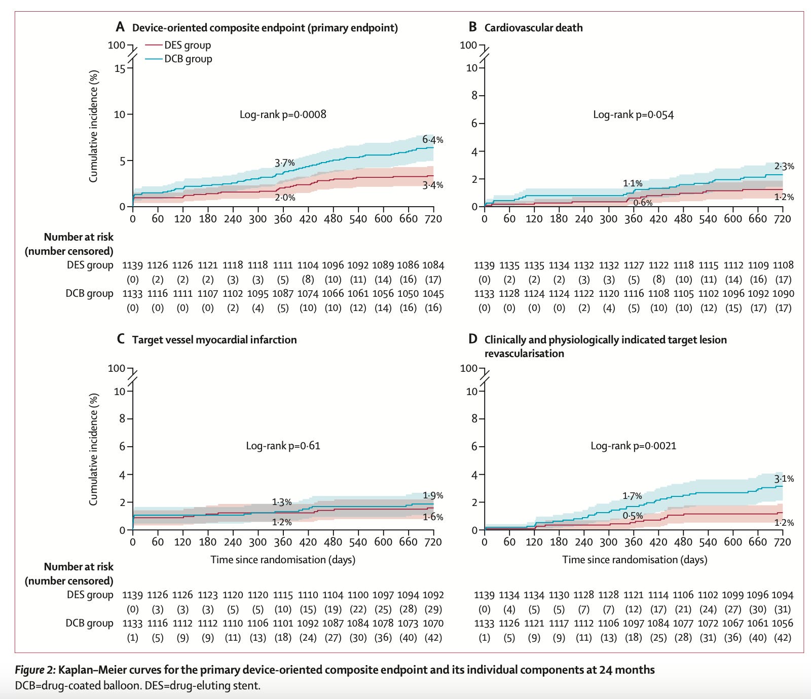 DoCE: 72 (6,4%) do grupo balão vs 38 (3,4%) do grupo stent, com uma diferença de risco acumulado de 3,04% ( 95% CI 4,52; p não-inferioridade = 0,65; two-sided 95% CI 1,27–4,81; p=0,0008).
