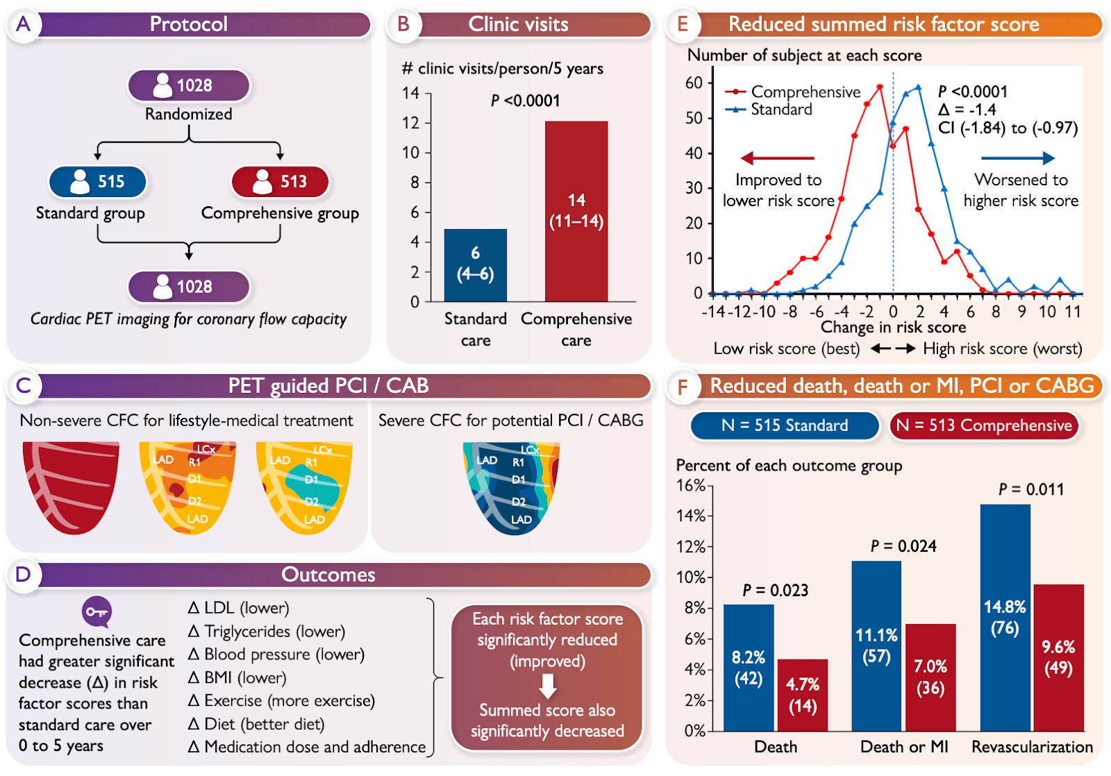 O protocolo de visitas, contato remoto e decisão de revascularização guiada por PET trouxe benefícios sustentados — com menos intervenções e mais sobrevida.