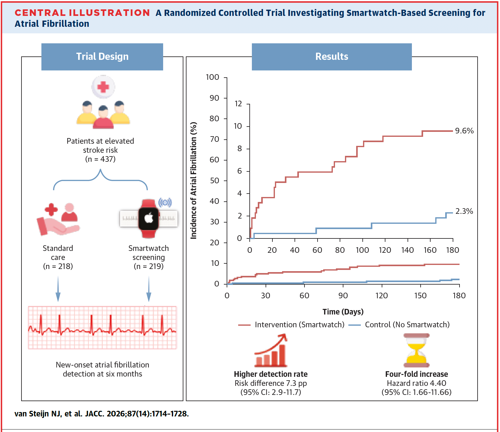 O estudo EQUAL, publicado no JACC 2026, traz exatamente essa provocação. Em um ensaio clínico randomizado com pacientes ≥65 anos e alto risco tromboembólico, a estratégia de monitoramento com smartwatch (Apple Watch) por seis meses foi comparada ao cuidado usual.