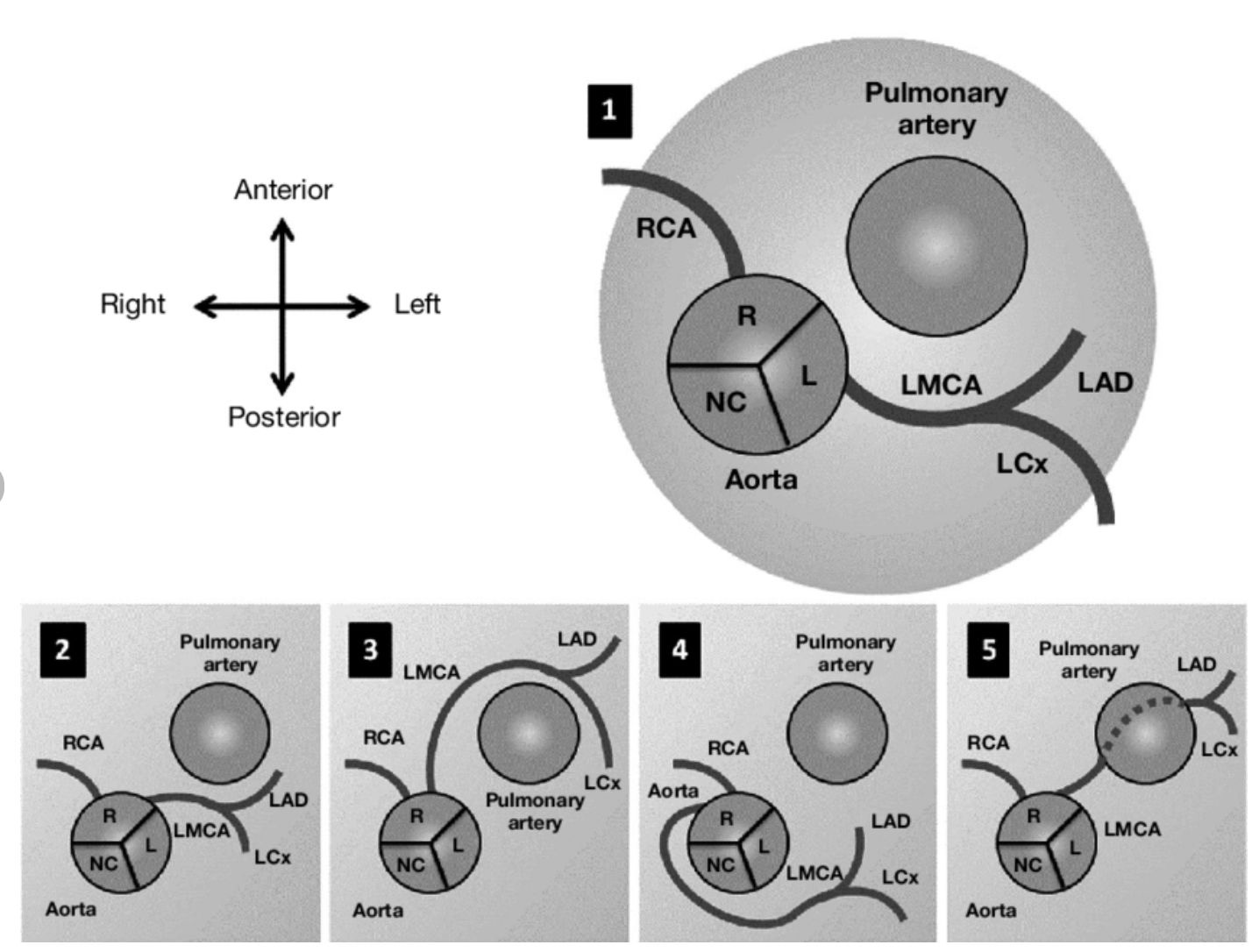 O próximo passo aqui é a realização de uma angiotomografia de coronárias para avaliação do trajeto da artéria, em especial se é interarterial (de maior risco), conforme a figura a seguir: