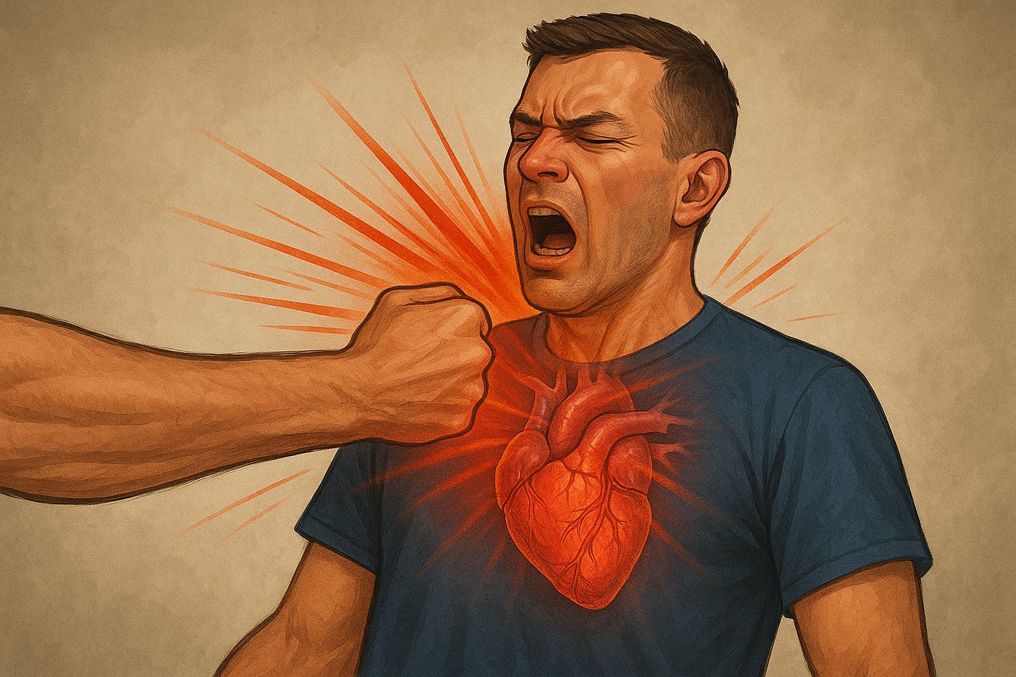 O segundo mecanismo, menos provável em adultos, mas sempre lembrado, é o commotio cordis, uma arritmia letal disparada por um impacto aparentemente banal no tórax, desde que ele ocorra em uma janela crítica de milissegundos da onda T.