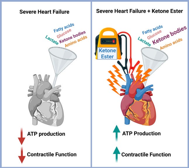 Assim, o aumento do fornecimento de cetonas para o coração é uma tentativa de compensar a redução geral no metabolismo oxidativo mitocondrial na disfunção cardíaca.