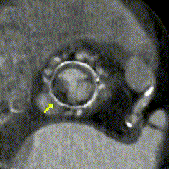 Trombose em prótese valvar aórtica biológica observada à angiotomografia do coração. Observe a restrição de abertura no folheto não-coronariano (seta amarela) em todas as fases do ciclo cardíaco.