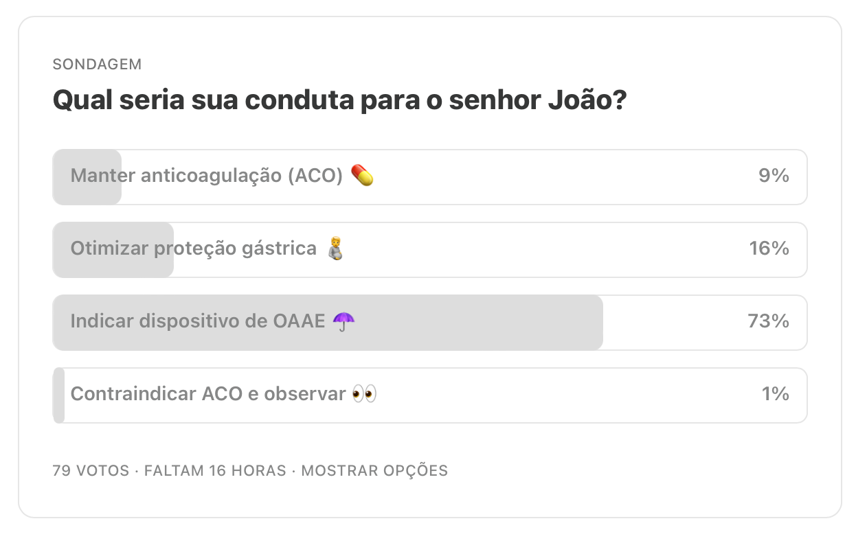 O cenário: pacientes com fibrilação atrial e idade avançada costumam apresentar risco de sangramento elevado ou contraindicação à anticoagulação e, portanto, devemos pesar o risco da anticoagulação oral. Este é o cenário que propõe-se haver o maior benefício para a OAAE.
