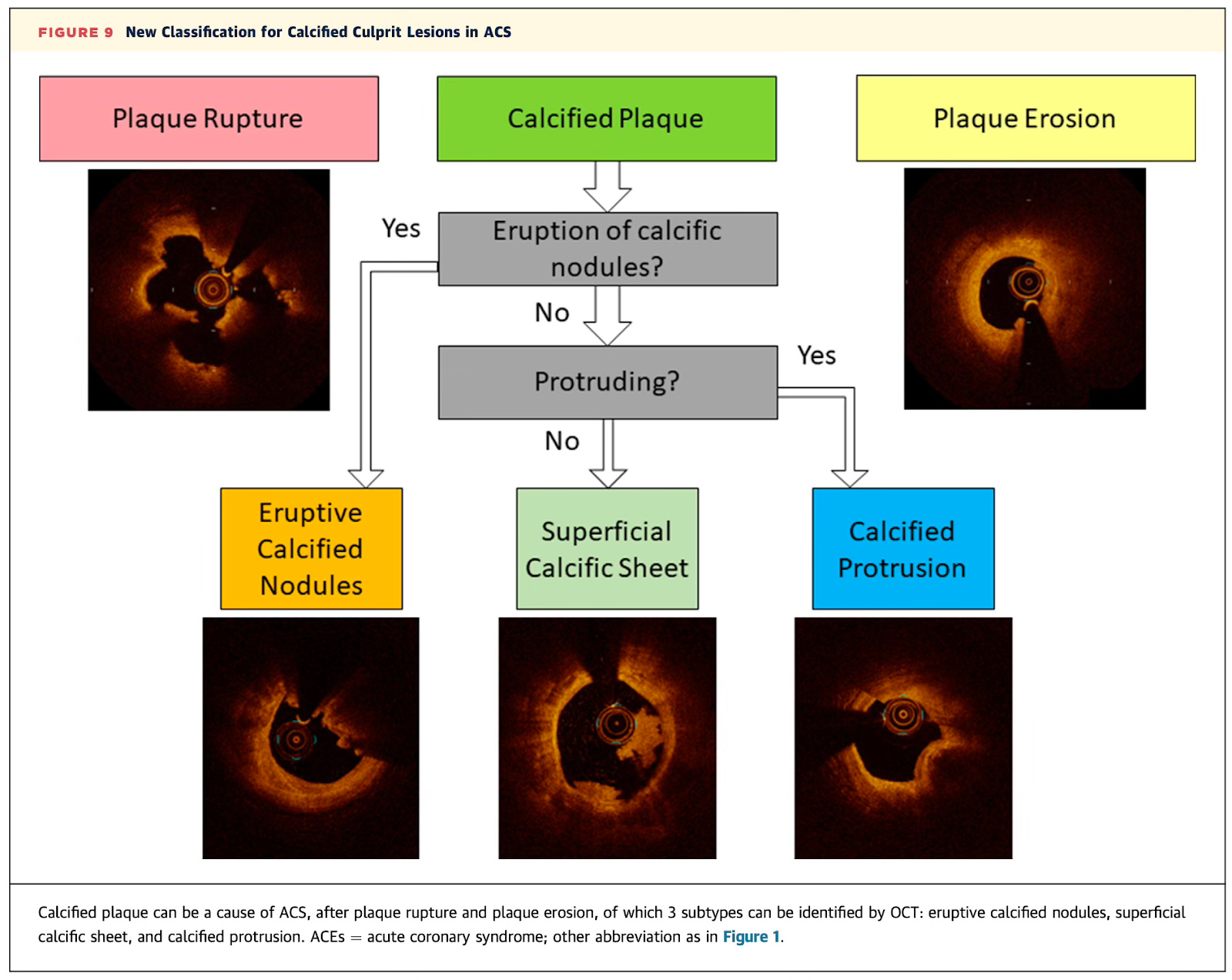 Agora, além de rotura e erosão de placa, temos a SCA com presença de cálcio na placa culpada: protusão calcífica, cálcio superficial e nódulo eruptivo.