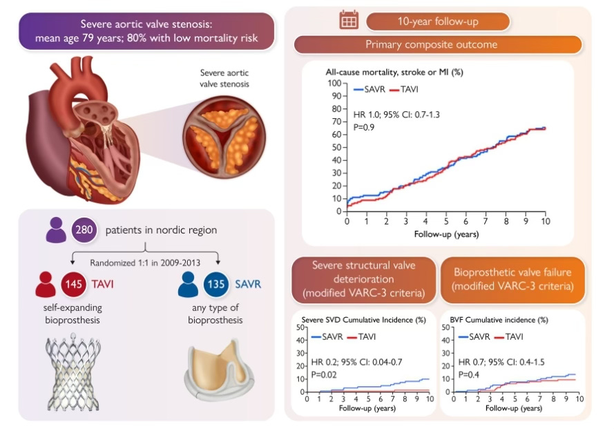 Nessa semana foram publicados os resultados de 10 anos de seguimento, focando em desfechos como mortalidade por todas as causas, acidente vascular cerebral, infarto do miocárdio, e disfunção / falha da bioprótese.