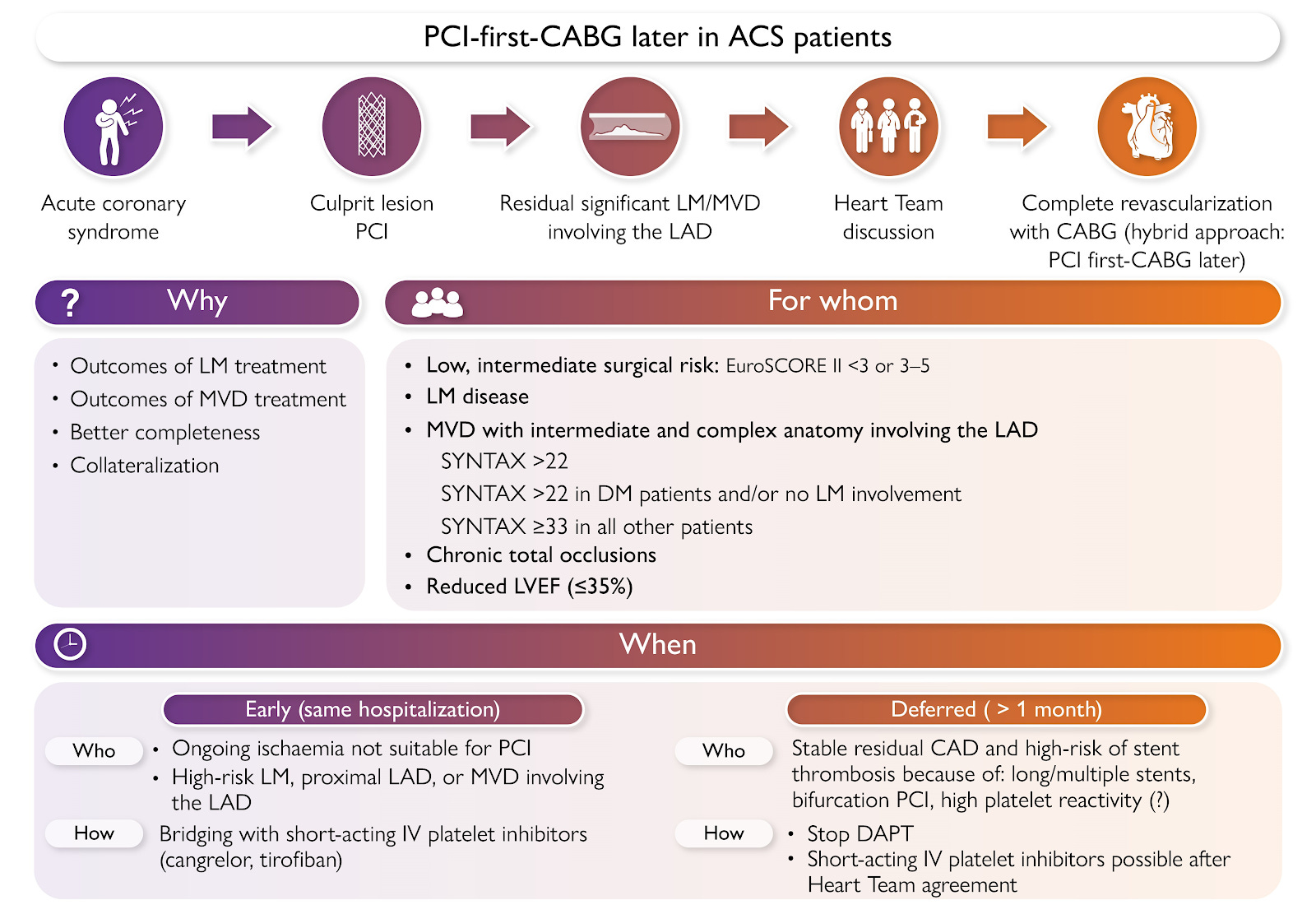 A partir dessa dúvida, surgiu a possibilidade do esquema “PCI first - CABG later”, ou seja, um tratamento híbrido envolvendo a abordagem intervencionista e a cirúrgica: após intervenção percutânea da lesão culpada, a cirurgia de revascularização é programada.