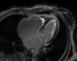 Ressonância magnética cardíaca em sequência de realce tardio ao gadolínio com a presença de fibrose subendocárdica difusa biventricular.