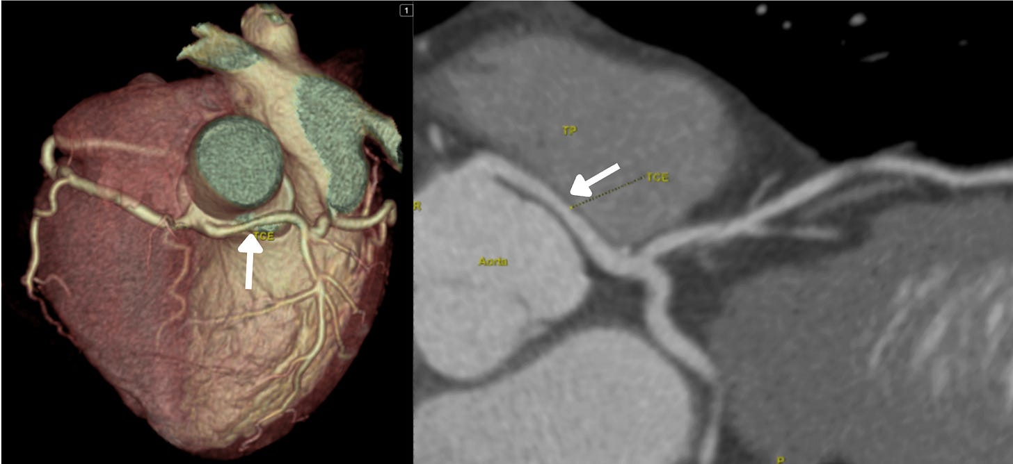 Paciente do sexo feminino, jovem, com quadro de dor torácica nos últimos 3 meses, em queimação, associada a estresse emocional e, ocasionalmente, ao esforço físico. Submetida à angioTC acima que observou alteração no TCE (seta branca). Qual o próximo passo?