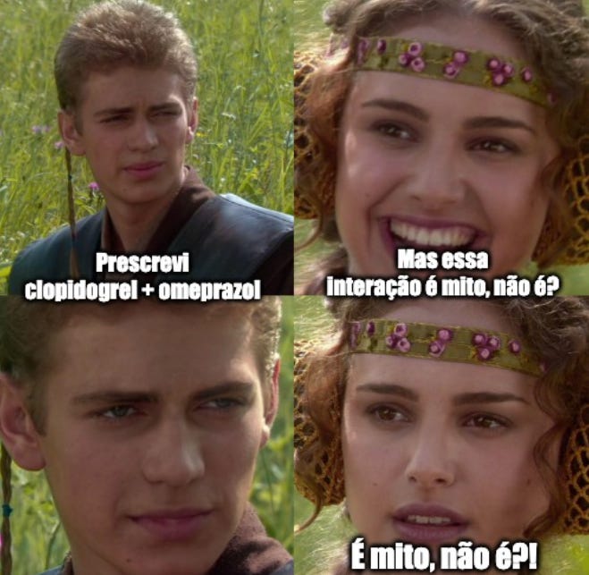 Estamos falando da associação entre clopidogrel e inibidores da bomba de prótons, como omeprazol, pantoprazol, esomeprazol e companhia.