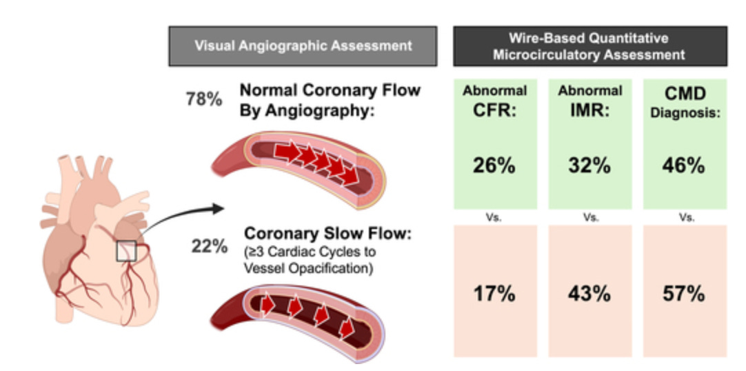 Realizou uma avaliação prospectiva da reserva de fluxo coronariana (RFC) e índice de resistência microvascular (IRM) de pacientes sem obstruções maiores que 50%. E comparou esses valores com a presença do slow flow (opacificação das coronárias após mais de 3 ciclos cardíacos).