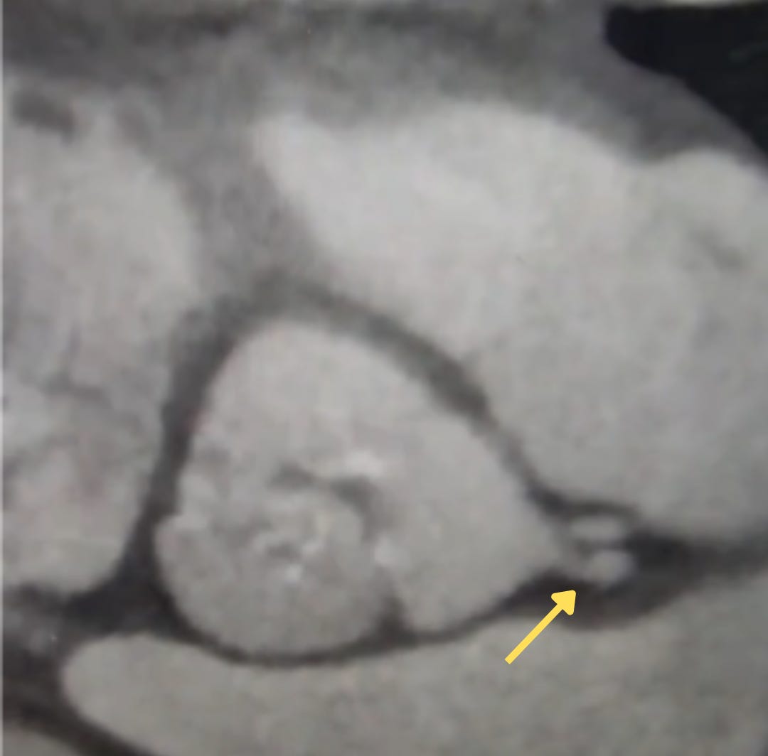 Note como a DA e a CX originam-se do seio esquerdo de óstios independentes (seta amarela) (seria essa uma evolução da nossa anatomia, anulando o risco de doença de TCE?)