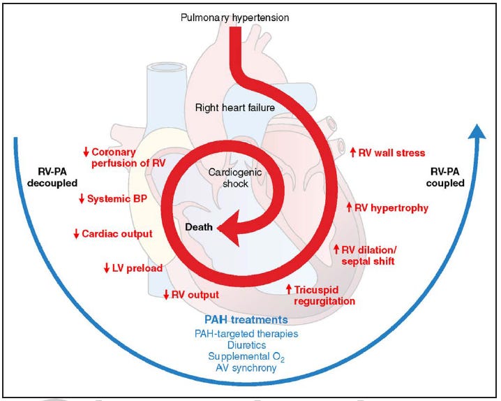 Aprecie essa clássica figura que resume o ciclo mortal da hipertensão pulmonar e do comprometimento do VD: