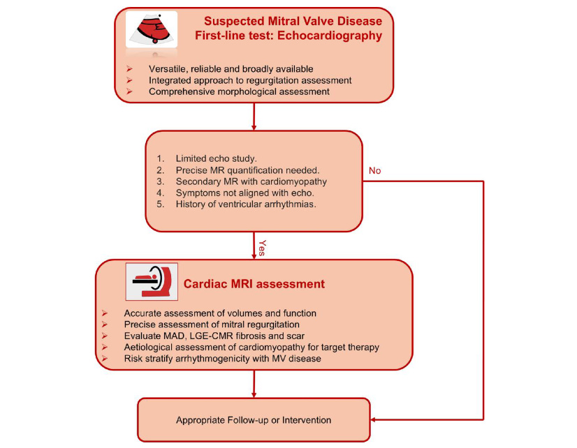 Em resumo, o artigo sugere um fluxograma com condições para a avaliação complementar pela RMC que incluem: limitações no estudo pelo ECO ou sintomas não alinhados com seus achados, quantificação precisa do volume regurgitante, regurgitação mitral secundária com investigação de cardiomiopatia e história de arritmias ventriculares.