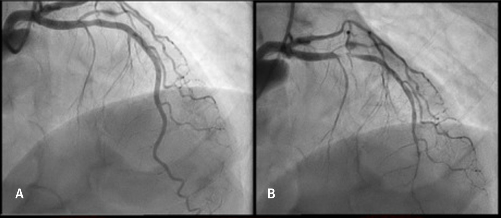 Como o tema da semana é vasoespamo, destacamos a imagem do próprio artigo de revisão sobre vasoespasmo e ateroesclerose. À esquerda: ADA com lesão focal discreta; À direita: lesão focal suboclusiva após administração de acetilcolina.