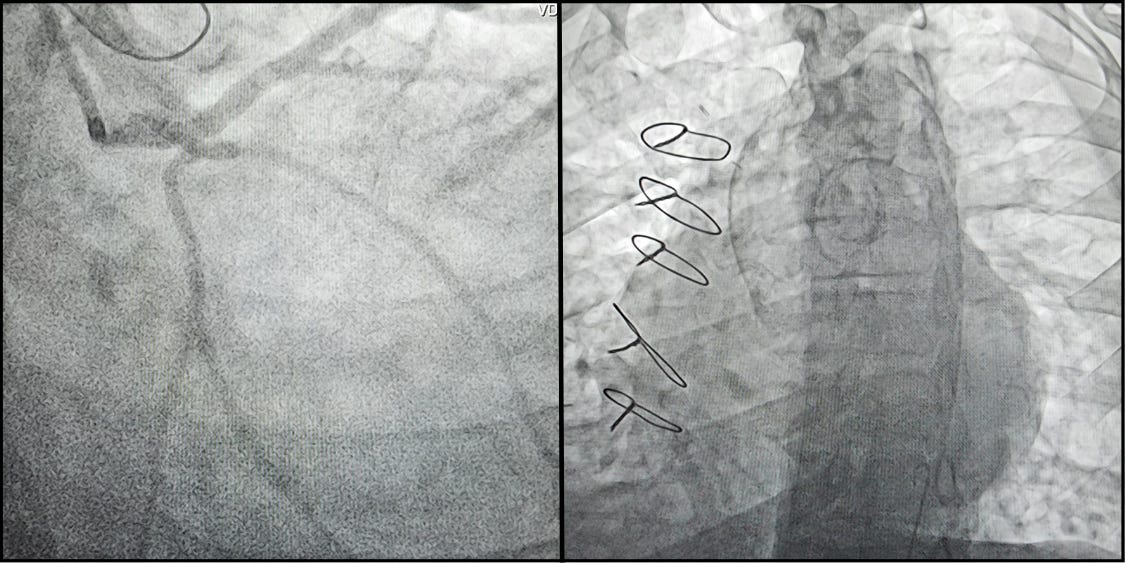 Paciente de 53 anos, submetido angioplastias e CRM com dupla mamária há 5 anos. Encaminhado devido a falha do resultado cirúrgico por oclusão da dupla mamária e presença de estenose aórtica importante.